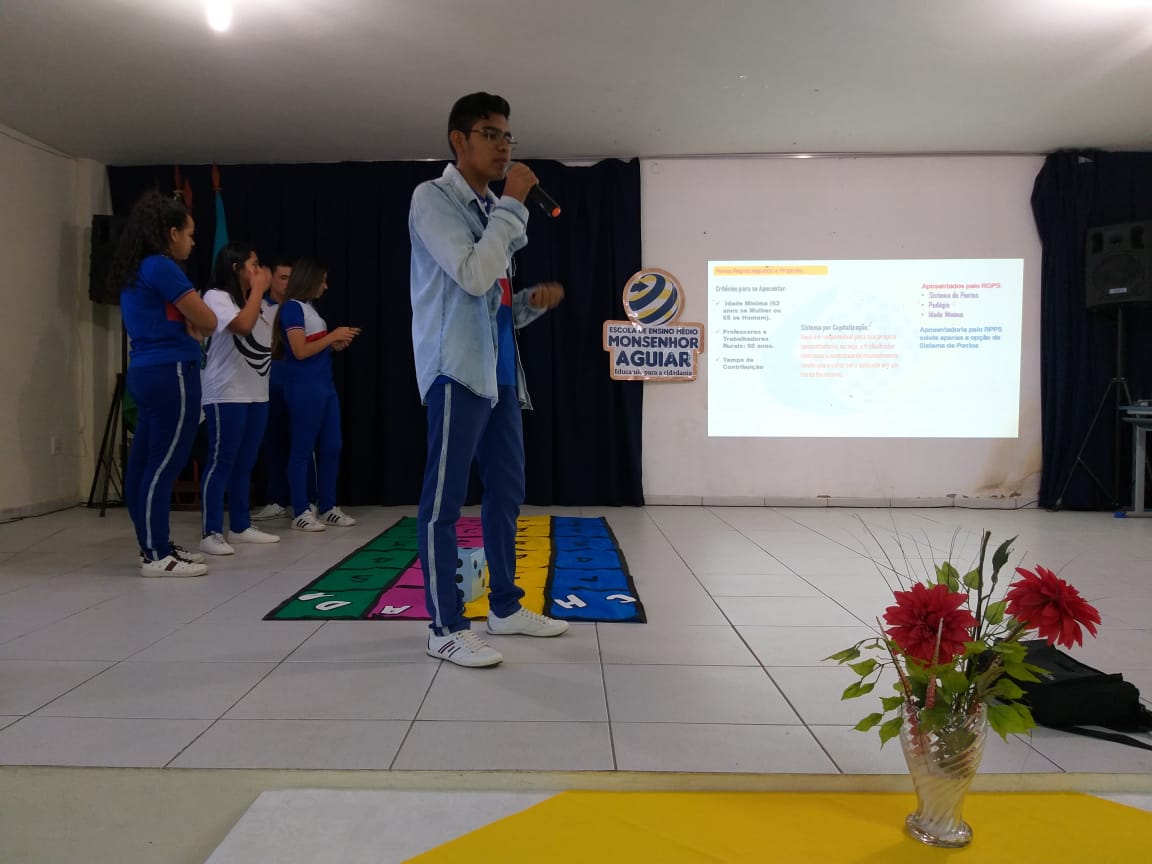 A Escola Monsenhor Aguiar recebeu hoje alguns alunos do Liceu José Ni Moreira, juntamente com a professora Vanderlúcia, que fizeram uma intervenção escolar com o objetivo de esclarecer questões sobre a Reforma da Previdência. A turma que participou da atividade foi a 3ª Série A, conduzida pela Professora Adriany.
